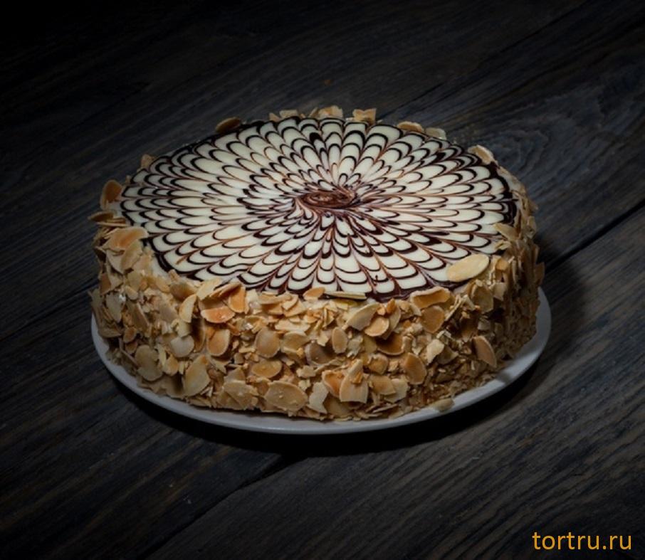 Воздушно-миндальные коржи, ореховое пралине, сливочно-заварной крем, миндаль.