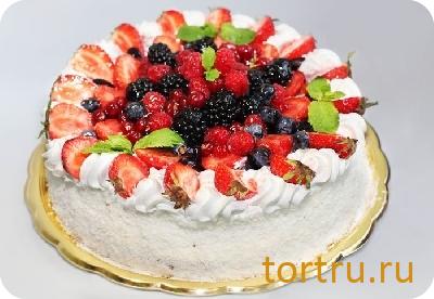 Белый бисквит послоен фруктовыми сливками, оформлен ягодами: клубникой, ежевикой, малиной.