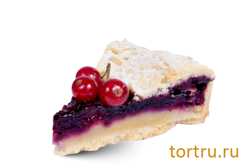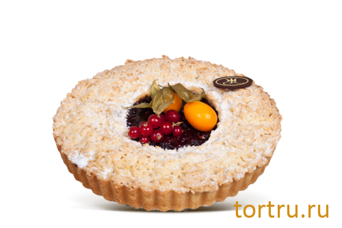 В основе песочное тесто в сочетании с воздушным апельсиново-миндальным кремом и желе лесных ягод. Украшен свежими ягодами.