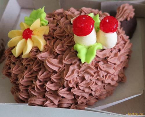 у не которых производителей торт ежик делают из бисквита. Здесь же всё не так и это радует. "тело" ёжика состоит из такого же состава, что и пирожное "Картошка", а сверху торт украшен масляным кремом со вкусом какао и оригинально украшен. Торт хоть и выглядит детским, но вот детям столько масла есть не рекомендую.