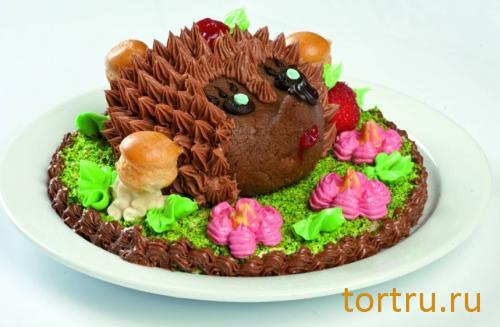 Шоколадный крошковый бисквит в форме Ежика, пропитанный сиропом и коньяком, украшен сливочным кремом.