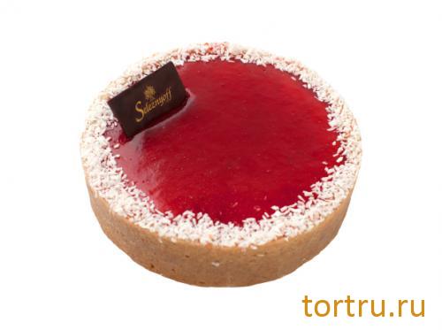 Выпечная сырно-творожная масса в сочетании с желе из свежей клубники на тонкой песочной основе с добавление корицы. Торт оформлен кокосовой стружкой и клубникой.