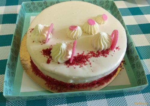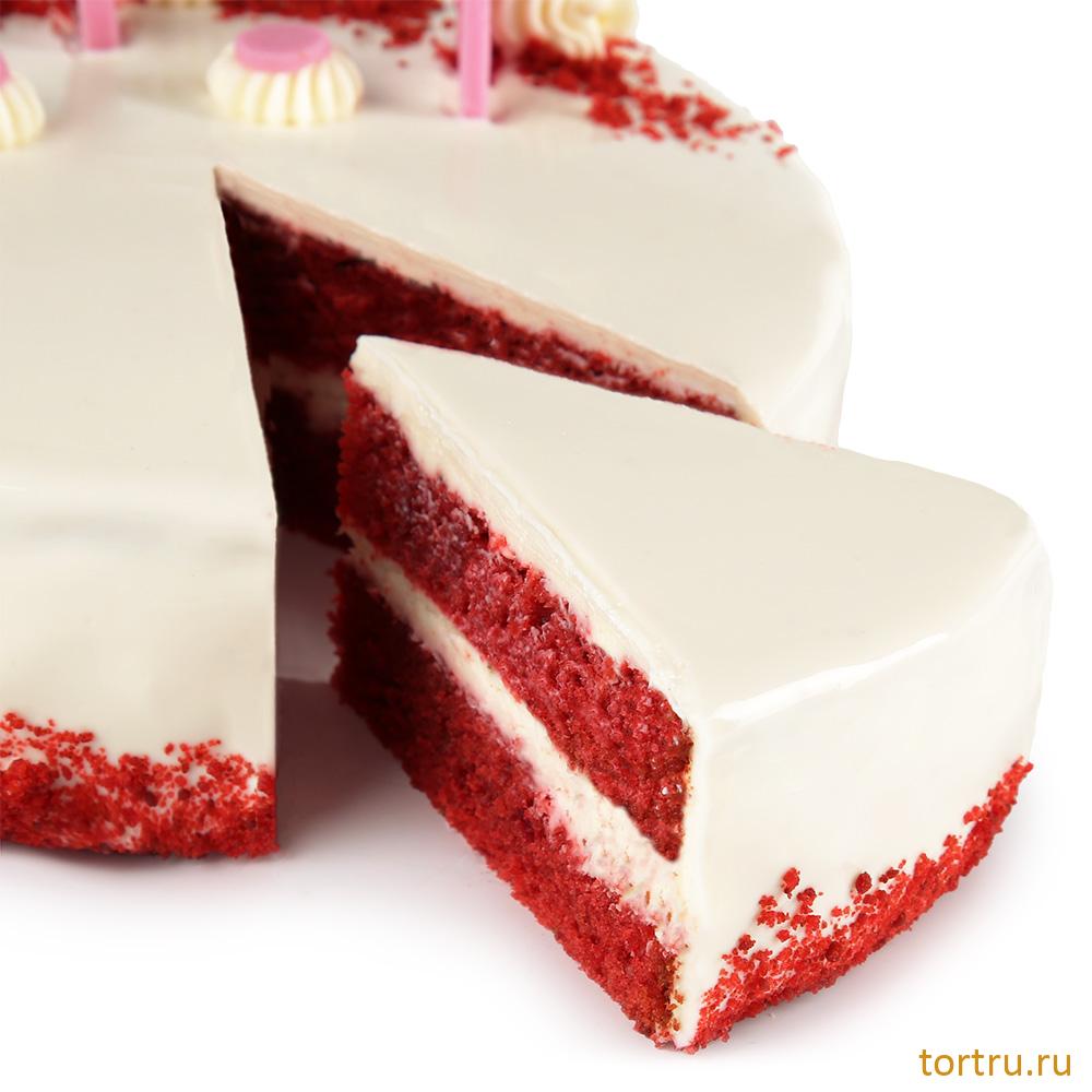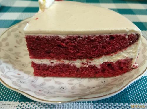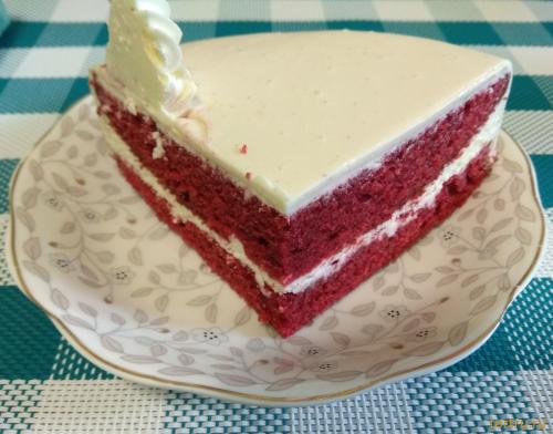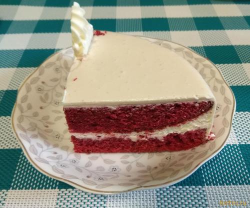 Широко известный в мире торт, ставший классикой, с масляно-бархатным бисквитом красного цвета и нежным творожно-сливочным кремом, покрыт глазурью на основе белого шоколада.