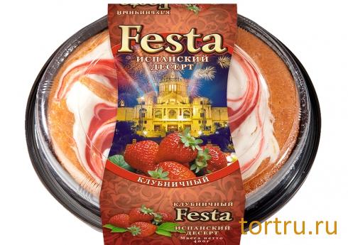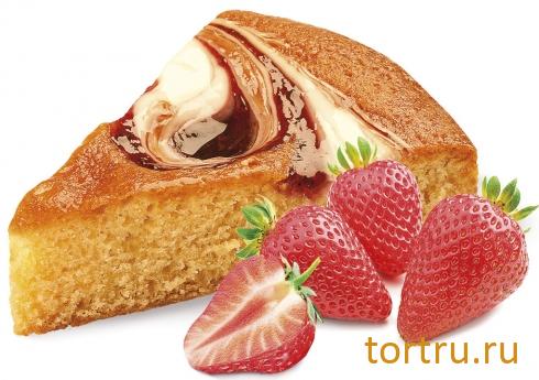 Пирог приготовлен на основе нежного бисквита с добавлением сливочной начинки и конфитюра с добавлением клубники.